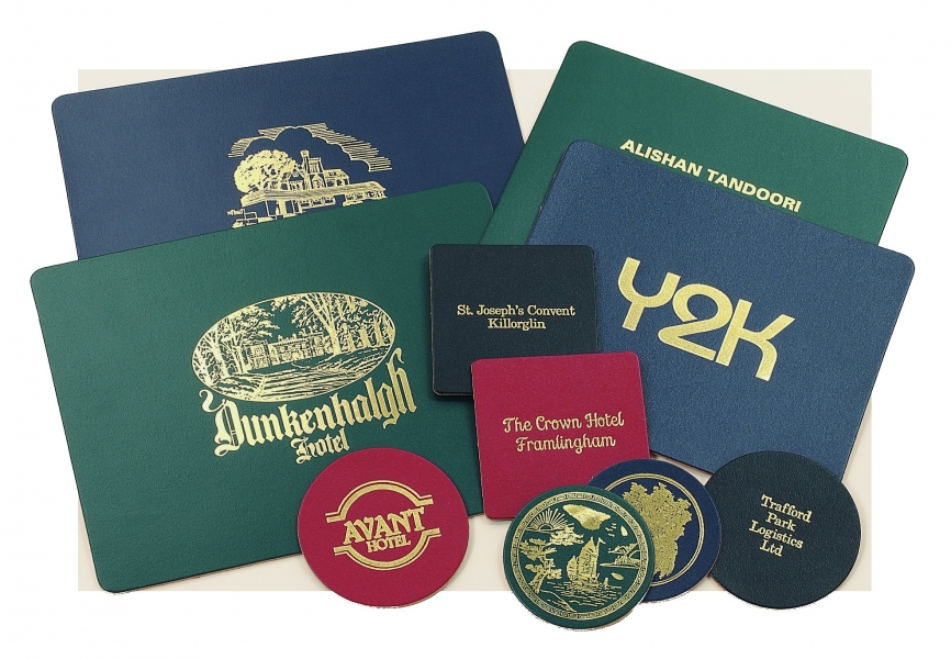 A standard within the trade. Bonded leather with cork backing can be die cut to most shapes! Ideal for promotions as well as protecting the table.