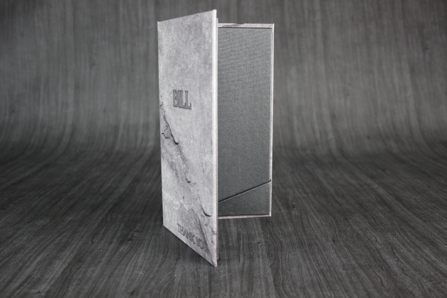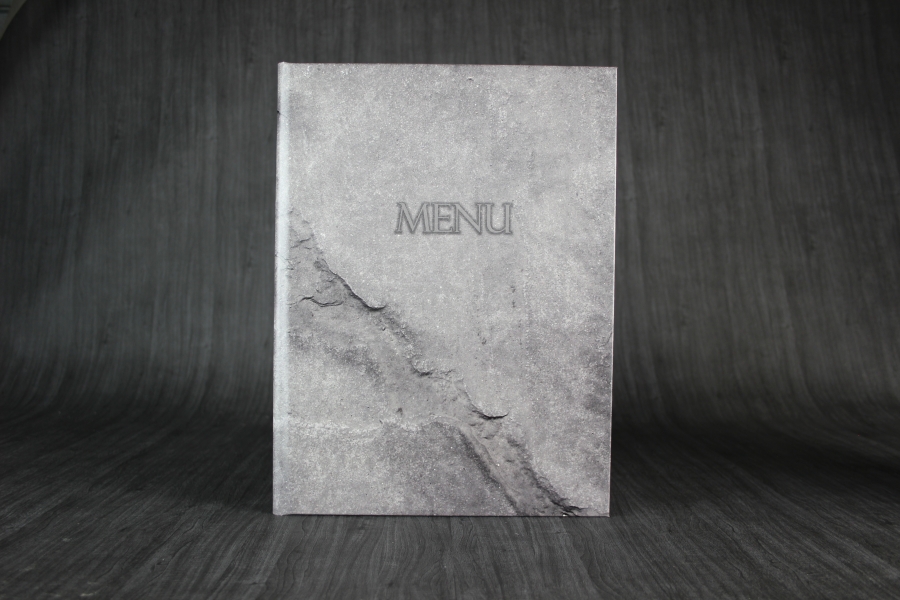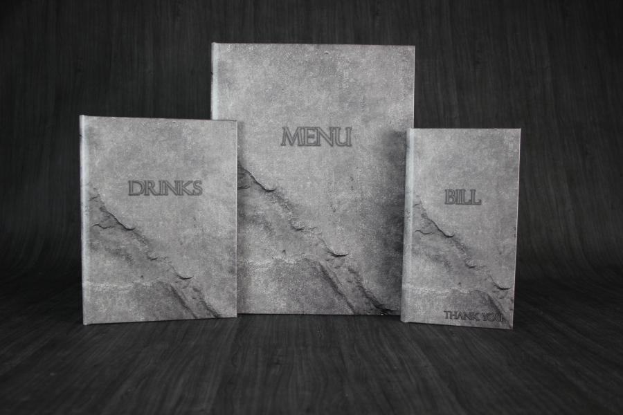 Our new luxury slate effect covers, these covers are full digital designs. The covers can be easily cleaned with a damp cloth and can be made up into any of the different styles of covers. You can have all matching items from menu covers to room folders to bill presenters. These covers can be fully personalised to suit your venue with foil printing or digital logos incorporated into the print.